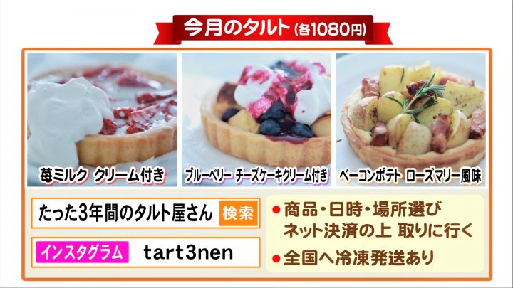 3月の月替わりのタルトは「苺ミルク クリーム付き」と「ブルーベリー チーズケーキクリーム付き」と「ベーコンポテト ローズマリー風味」(各1080円)の3種類です。お店の仕組みは、ネット上で商品と日時を選び決済の上、無人店舗に受け取りにいきます。全国への冷凍発送も行っています。
