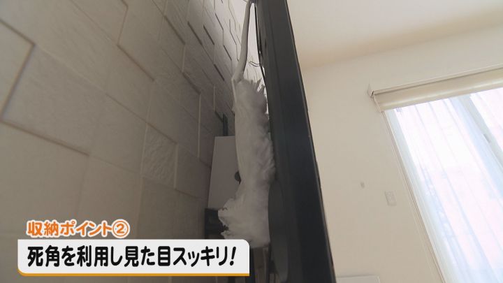 「テレビの裏にモップが収納してあるんですけど。視界に色んな物が置いてあると、人ってストレスがたまったりとか何かザワザワすると思うので、やっぱりテレビだったらテレビしか見えない感じにした方がスッキリします」