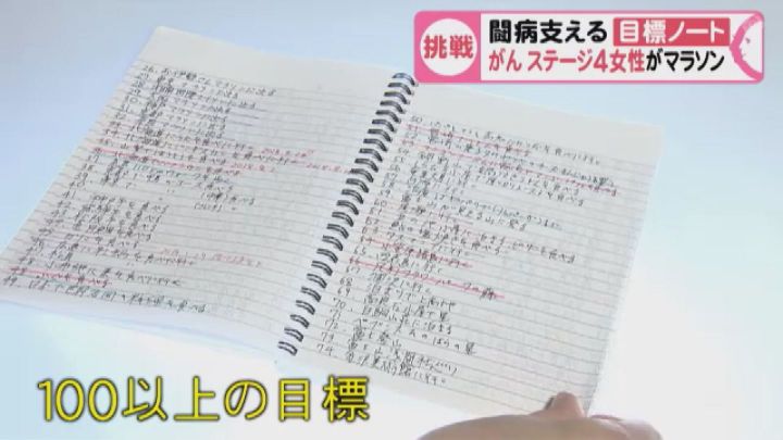 ステージ4のガンと闘う女性が、3月13日に開催された名古屋ウィメンズマラソンで人生2度目のフルマラソンに挑戦しました。原動力となったのは、苦しい治療の励みとなっている100以上の目標を綴った目標ノートです。女性は見事マラソンを完走し、再びノートに次の目標を書き込みました。