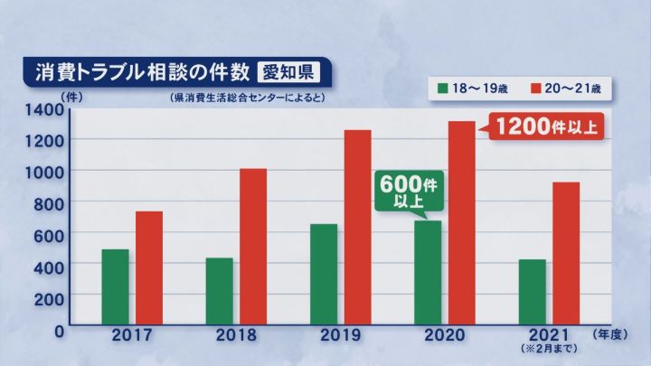 実際に、2017年から2021年までに愛知県内の消費生活センターに寄せられた、「投資やネットビジネスなどの相談」の件数を見ると、18歳と19歳は400件から600件あまりでしたが、20歳と21歳は800件から1200件と倍近くに増えています。