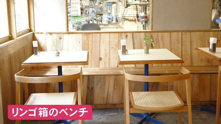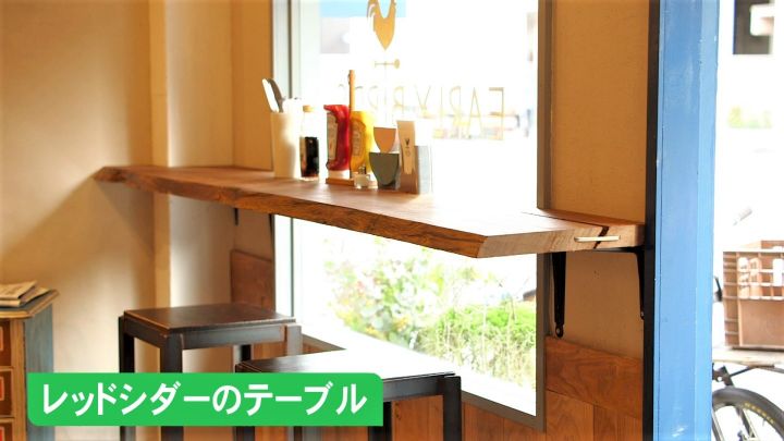 リンゴ箱はベンチに。大きなレッドシダーの一枚板は、窓際のテーブルになりました。