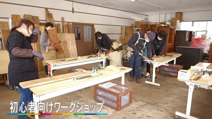 古材の魅力を知ってもらうために、リビセンでは初心者向けのワークショップを開いています。この日は、古材を繋ぎ合わせてテーブルを作ります。