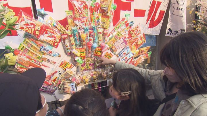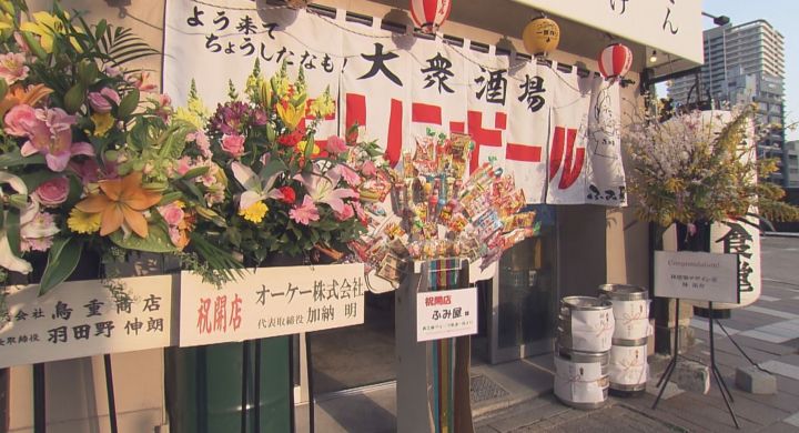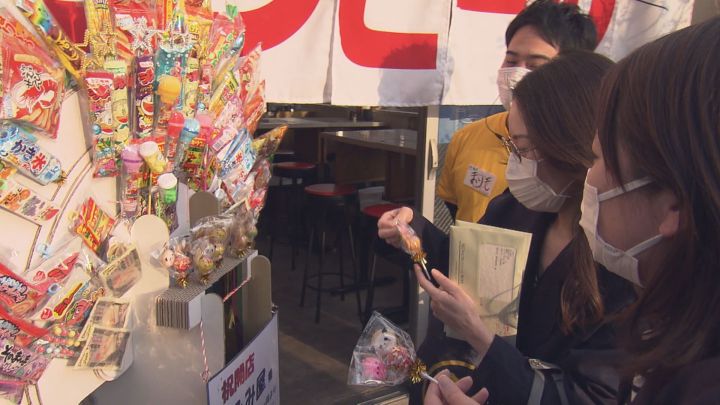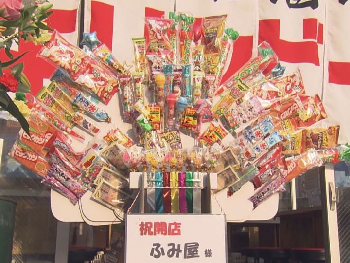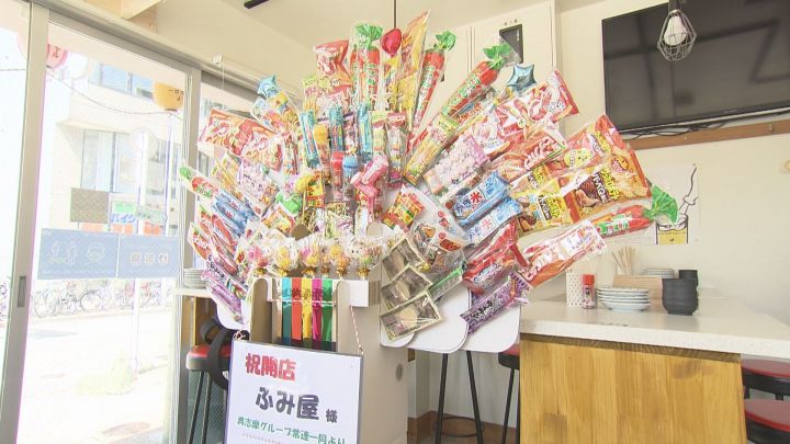 3月下旬にオープンした名古屋市中村区の居酒屋「ふみ屋 錦橋店」。店先に置かれたのは祝い花のように飾られた“駄菓子”、その名も「ハッピーお菓子スタンド」です。