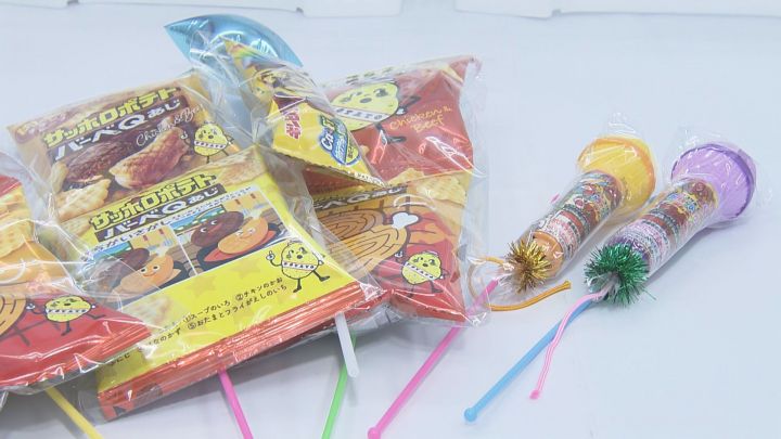 2021年の秋ごろから、おもちゃや駄菓子の卸売り会社・堀商店と共同開発をすすめ、わずか3か月で商品化しました。衛生面にも配慮し菓子は個包装に。スムーズに取り外せるよう、棒も取り付けました。