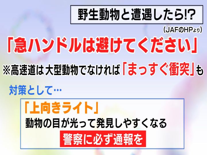 もし運転中に野生の動物と遭遇したらどうすればいいのか。JAFによりますと、まず警戒標識に注意してください。そして、野生動物に遭遇しても急ハンドルは避けてください。動物を避けようとして、別の事故をひき起こさないようにするためです。