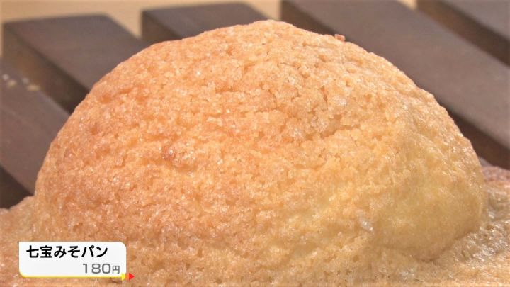 外はサクサク、中がふんわり…。みそとバターが混ざり合いキャラメルのような味わいの「七宝みそパン」は、みそとパンの意外な組み合わせが受けて大ヒットとなっています。
