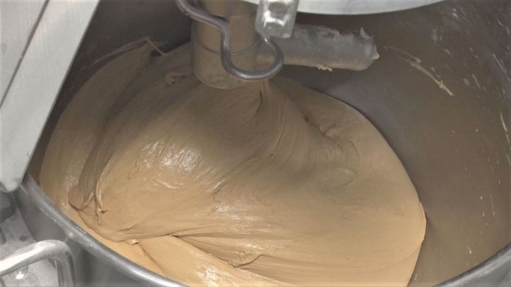 クッキー生地ではなく、パン生地にみそを練りこんだ悲願の“みそ食パン”作り。まずは、社長がパン生地に合うようあみ出した特別なみそを練り込みます。