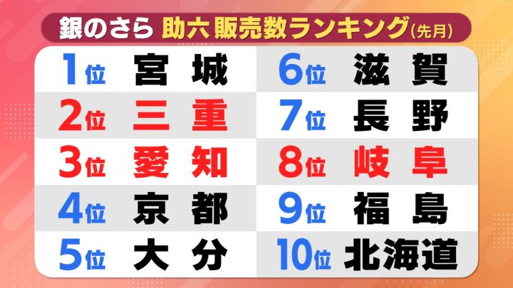 トップテンには北海道から九州までまんべんなく並んでいますが、2位:三重、3位:愛知、8位:岐阜と、東海三県全てがランクインしています。東海地方での助六の浸透率はかなり高いといえそうです。