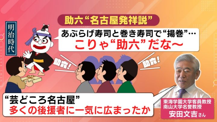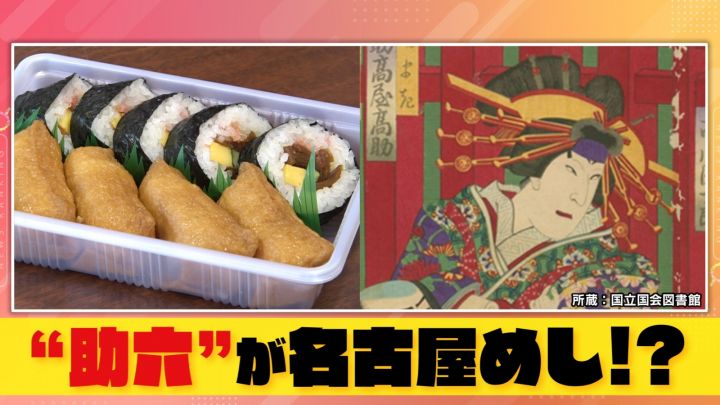 「助六という名前が付いたのは、4代目・助高屋高助(すけだかやたかすけ)という役者さんが来て、助六を熱田の芝居小屋で演じた。(後援者が)差し入れを持っていくことになるんですが、夏の盛りなので生寿司は遠慮して持っていったのが、あぶらげ寿司と巻き寿司のセット。セットを持っていったら、4代目・助高屋高助が『こりゃ、助六だね』と言ったのが始まりだということになっています。最初に洒落で役者が言ったということになると、これは洒落ているなとなれば皆さん方が広めちゃうと。やっぱり芸どころ(名古屋)がかかってくるわけです」