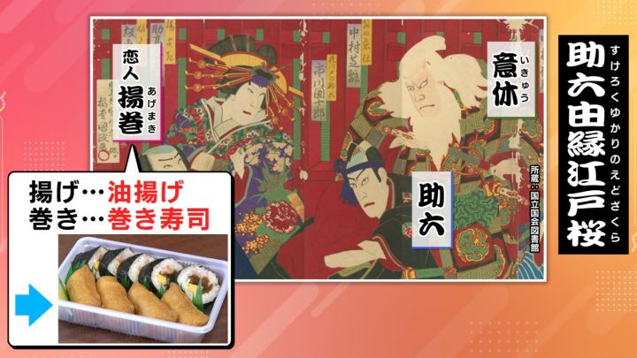 その中に出てくる助六の恋人が、吉原でトップスターの「揚巻(あげまき)」で、このあげまきの名前から、「揚げ」が油揚げ、「巻き」が巻き寿司ということで、助六という寿司の名前になったということです。