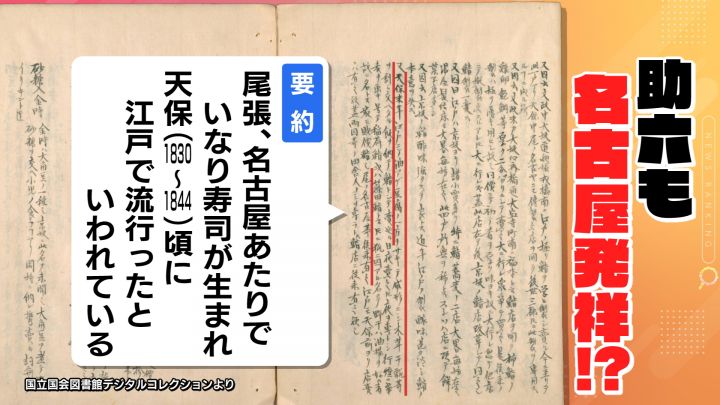 さらに、当時の庶民の文化をまとめた江戸時代の百科事典「守貞漫稿(もりさだまんこう)」には、いなり寿司の発祥に関して、「尾張、名古屋あたりでいなり寿司が生まれ、天保(1830~1844)頃に江戸で流行ったといわれている」と記述があります。