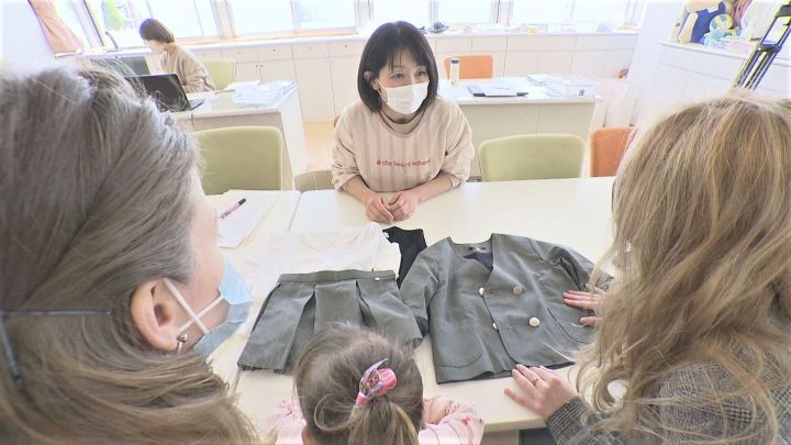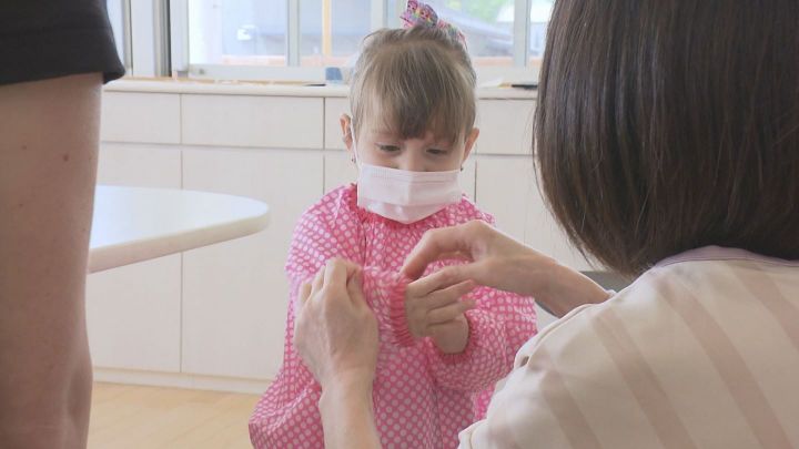 ミアちゃん、さっそく幼稚園の制服に袖を通します。娘のかわいい姿に、ナタリヤさんも笑みが…。先生とのやり取りは、県から支給されたばかりの“AI翻訳機”で行います。