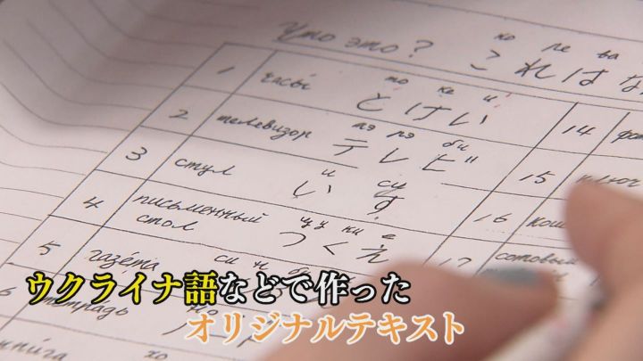 「彼女用にドリルを作ってあげた、手製です。『あ、い、う、え、お』ロシア語で。これ『ウクライナ』という字ですね、ウクライナ語です。これを(日本語で)書かせるわけです」