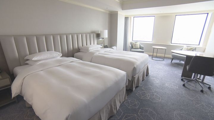 「名古屋駅の地上34階にあるホテルの部屋。今日からキャンペーンを使うと、いつもより5000円安く1人1万円ほどで泊まることができます」