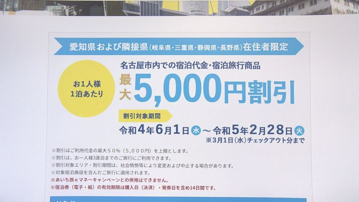 名古屋市内166の宿泊施設が対象で、期間は6月1日の宿泊分から2023年2月末まで。利用できるのは東海3県と静岡、長野の県民に限られるほか、新型コロナワクチンを3回接種した証明書か、陰性証明書が必要です。