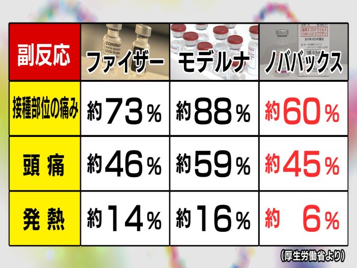 海外の研究データから、それぞれのワクチンを2回接種した場合の副反応の頻度についての厚生労働省のまとめによりますと、接種部位の痛みはノババックス製はファイザー・モデルナより低いとされています。