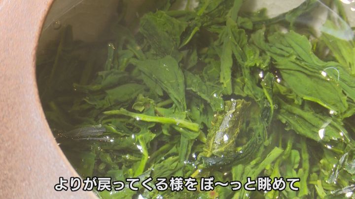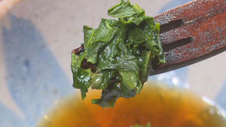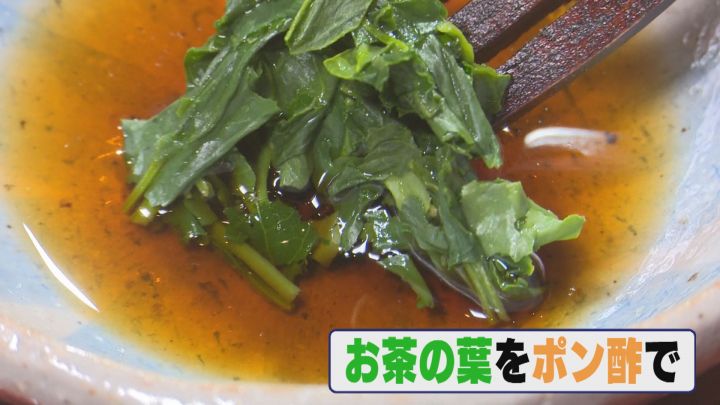 最後は、淹れ終えた茶葉をポン酢で。かぶせ茶は、茶葉に黒い布などを覆いかぶせて栽培されているお茶で、柔らかいのが特徴。茶葉の渋みとポン酢の酸味が絶妙で、口の中に優しい味が広がります。