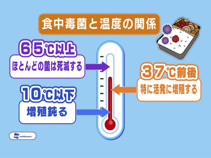 気温が10度以下となると食中毒菌の増殖は鈍り、65度以上になるとほとんどの菌が死滅します。