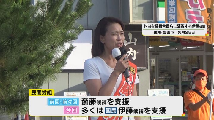 斎藤さんを支えてきた連合傘下の労働組合のうち、全トヨタ労連など民間の労組の多くは今回、国民民主党の伊藤孝恵さんを支援。