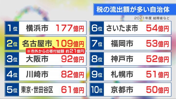 名古屋市は2021年度、ふるさと納税による税の流出額が、横浜市に次ぐ2位の109億円でした。3位以下も都市部の市区町村が並んでいます。