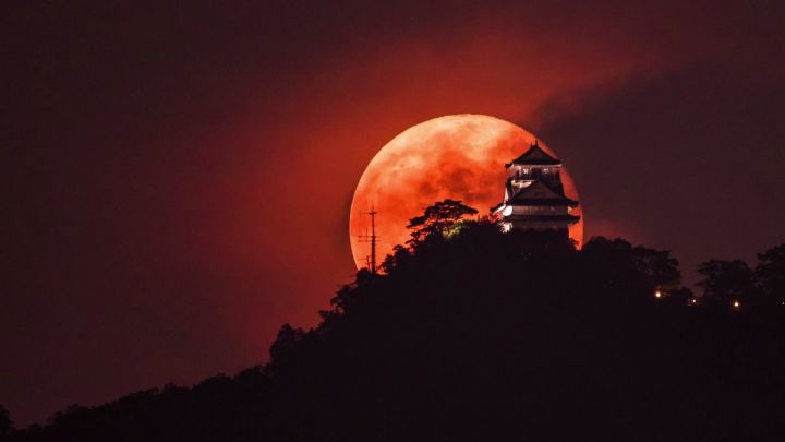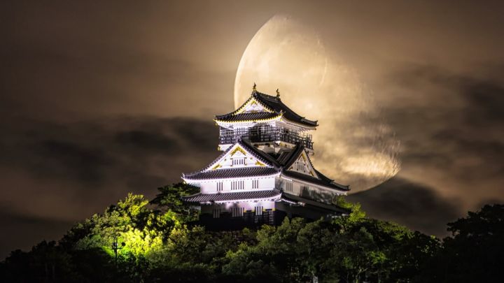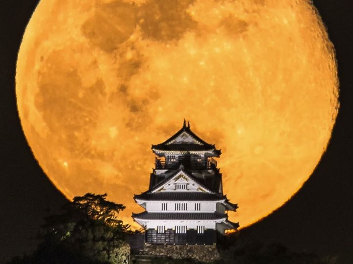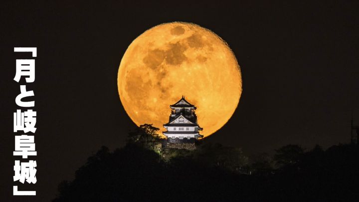 「月と岐阜城」…。金華山の頂上にそびえる岐阜城の背後に、巨大な満月がくっきりと輝いている。
