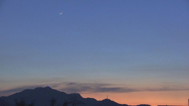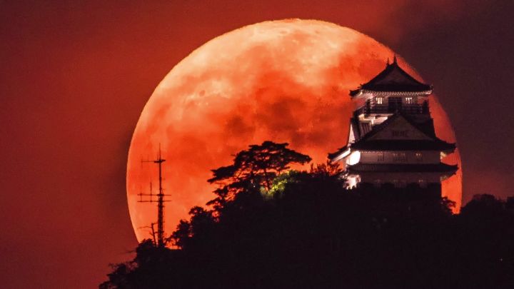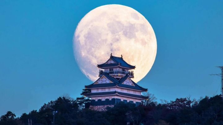 遥か彼方の月はどこから撮っても同じ大きさだが、城は離れれば離れるほど小さくなる。そのため、遠くから望遠レンズ越しに見ると、月だけが大きく見える。