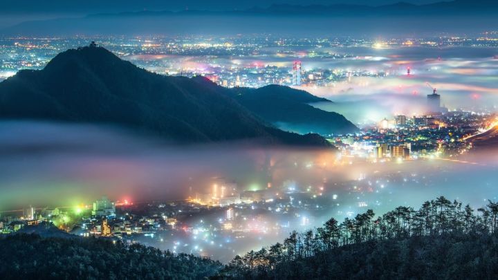 もう1つの代表作は「宝石箱」のような作品だ。薄い霧が岐阜市内を覆い、月明かりや街の灯が照らす。