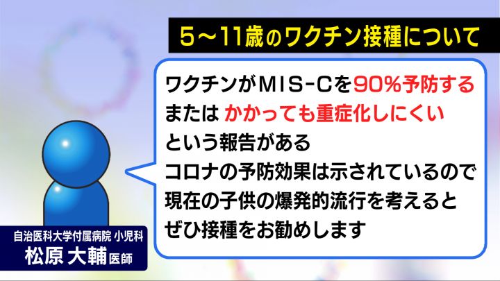 5歳〜11歳のワクチン接種について、自治医科大学附属病院小児科の松原医師は「コロナワクチンが90%、MIS−Cを予防する。または、かかっても重症化しにくいという報告がある。そもそも小さい子供への予防効果は示されているので、現在のコロナの子供の爆発的流行を考えるとぜひ接種をお勧めします」としています。