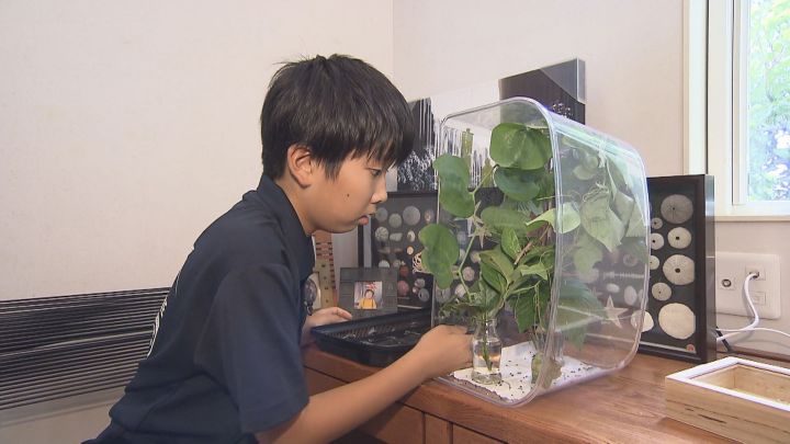 虫が大好きな泰成くんは、小学校1年生のときに一匹のトゲナナフシを飼い始めて卵を産ませ、いまでは毎年100匹ほどを育てているといいます。