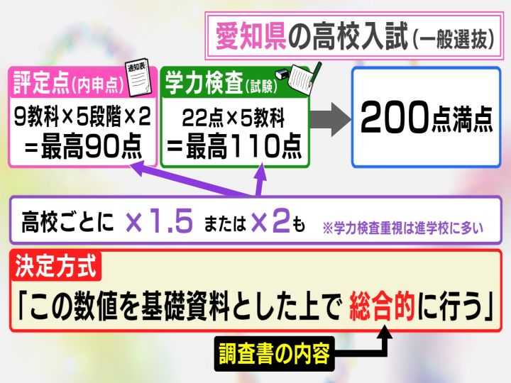 愛知県の高校入試一般選抜は評定点、いわゆる内申点は9教科5段階を2倍し、最高で90点。そして学力検査は各22点の5教科で最高110点。この2つを足して200点満点となってはいます。