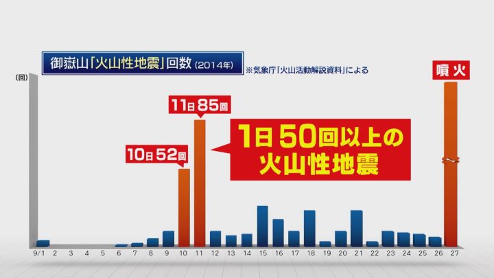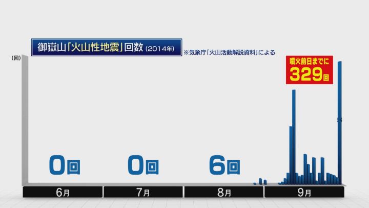 実は噴火があった9月、御嶽山ではいくつもの前兆が起きていた。噴火の約25日前から、火山性地震が累計で329回発生。直近の月と比べても、明らかに注目すべき変化だった。