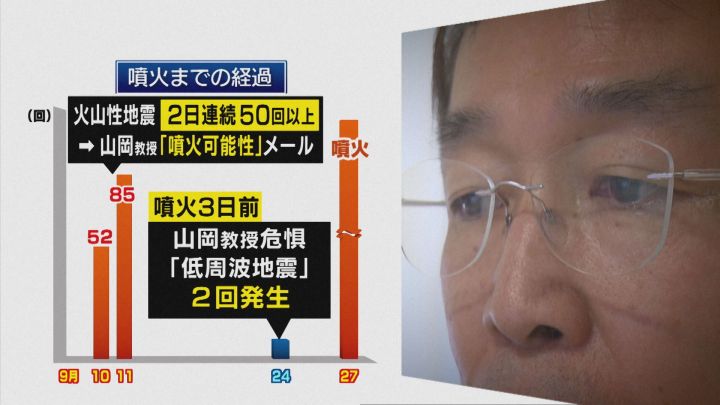 9月10日・11日と、2日続けて50回を超える火山性地震が発生。この時点で山岡教授は、気象庁にメールで噴火の可能性を伝えた。さらに噴火の3日前、山岡教授が危惧した「低周波地震」も2回発生。