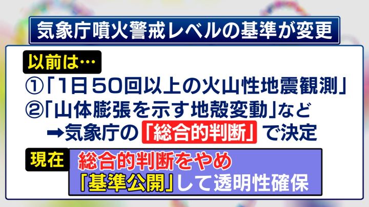 御嶽山の噴火以降、気象庁の噴火警戒レベルの基準が変更されている。以前は「1日50回以上の火山性地震観測」や「山体膨張を示す地殻変動」などの「指標」に加え、最終的には気象庁の「総合的判断」で決定していた。