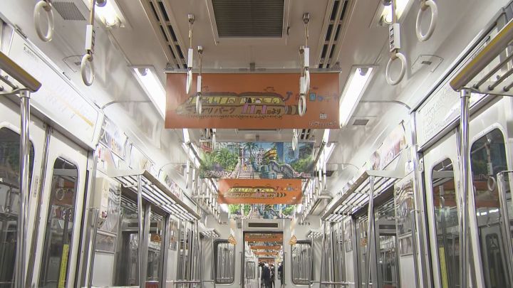 6つの車両すべての広告スペースがジブリパークになった特別車両。2週間の期間限定・1編成のみの運行で、ロボット兵や借りぐらしのアリエッティなど、ジブリパークの雰囲気に包まれています。