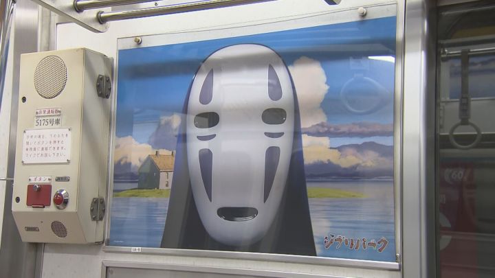 「こちら一見普通の列車なんですが、頭上の広告スペースには湯婆婆が、中吊り広告にはネコバスが描かれています」