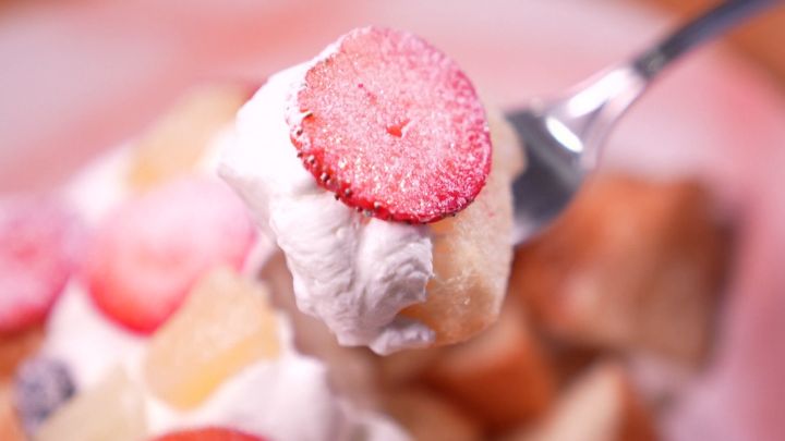 焼きあがった生地に、とろ~り濃厚な生クリームをたっぷりと…。飾りつけに、季節のフルーツを添えれば完成。