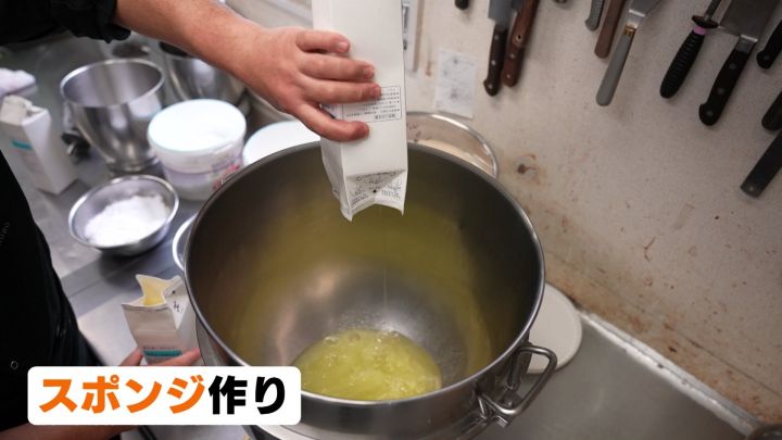 客が絶賛する、看板メニューの「ふわとろショートケーキ」。そのおいしさのヒミツを、少し見せてもらった。はじめに取り掛かるのはスポンジ作り。