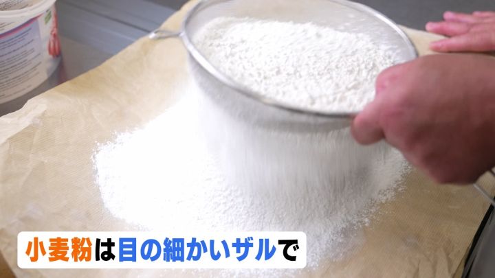 卵白と同じ理由で卵黄も一度凍らせたものを使う。小麦粉は、目の細かいザルで越す。こうすることで空気を含み、焼き上げた時にふんわりとなる。