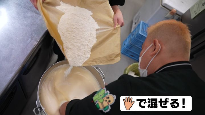 これらの材料を混ぜ合わせるのに機械を使うと力が強すぎて気泡を潰してしまうため、微妙なサジ加減が必要な工程は、手作業だ。客を驚かせるフワッフワな食感を実現するためには、手間を惜しまない。