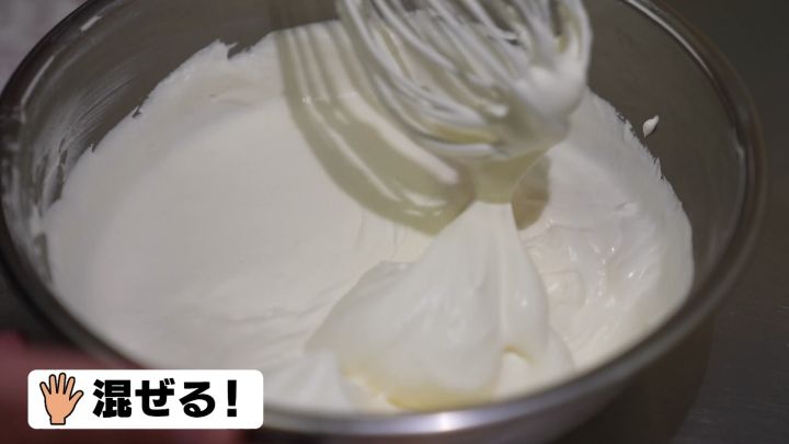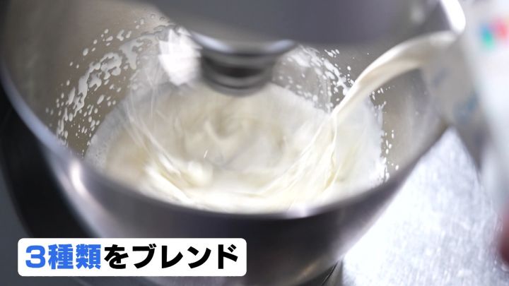 続いては、このケーキのもう一つのポイントの「生クリーム」作り。乳脂肪分が異なる3種類のクリームをブレンドすることで、コクがありなめらかな口当たりになるそうだ。