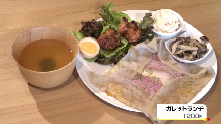 人気メニューは「ガレットランチ」(1200円)。地元産のそば粉「知多美人」を配合したガレット生地に、チーズと卵、そして国産もち豚のももハムを包んだ料理で、女性客を中心に人気の一品だ。