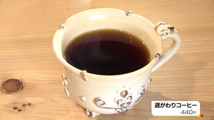 コーヒーも、地元の名店が焙煎して作り上げたオリジナルブレンドだ。ハンドドリップで丁寧に抽出する。「週がわりコーヒー」(440円)。