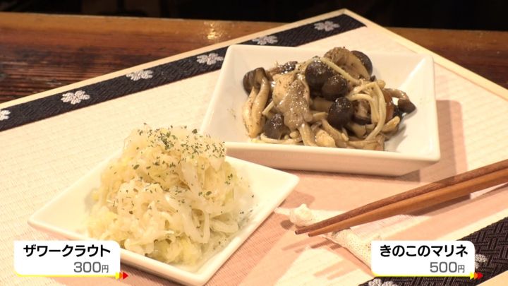 フードメニューも、「ザワークラウト」(300円)や「きのこのマリネ」(500円)など、おつまみ系はもちろん…。