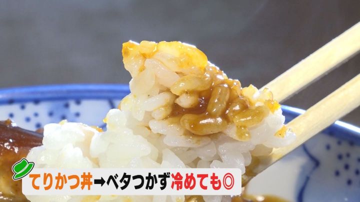 卵でとじる通常タイプのカツ丼は、時間の経過とともにごはんにタレがしみこみ、ベトっとしてしまう欠点があるが、てりかつ丼はタレにとろみがあるためその心配がなく、冷めてもおいしいことから人気が定着したという。