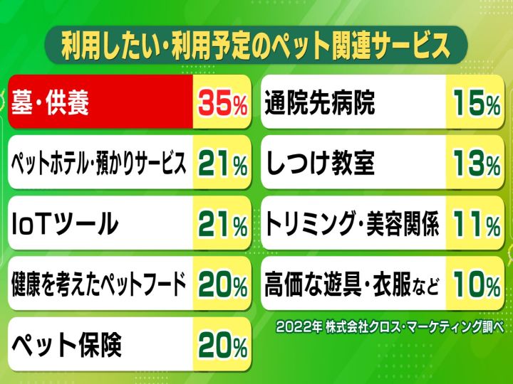 コロナ禍による生活の変化でペットの人気が高くなっています。それに伴い、ペットを飼っている人に利用したいサービスを聞くと、「墓・供養」が35%と最も高い結果となりました。イマドキのペットの葬儀について調べました。