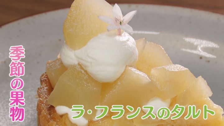 そのメニューが季節の果物をたっぷりと使ったフレッシュなタルト。ラ・フランスを贅沢に使っている。