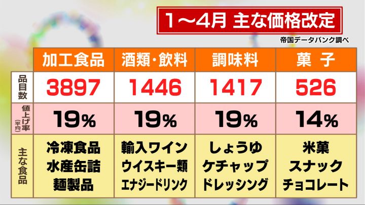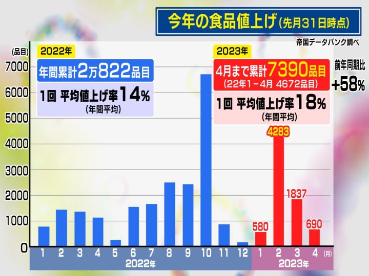 帝国データバンクがまとめたデータでは、去年は年間で累計2万822品目の食品で値上げがありました。平均値上げ率は14%とされています。