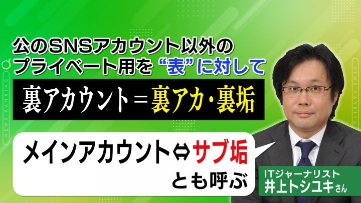 「インターネット犯罪大全」の著者でもある、ITジャーナリストの井上トシユキさんによると、もともとは公にしているSNSのアカウント以外のプライベートで使うものを、ネットスラングで表に対して「裏アカウント」=「裏アカ・裏垢」と呼ばれていました。また同じ意味で、メインアカウントに対して「サブアカ・サブ垢」と呼んだりもします。