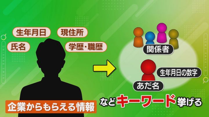 「キーワード検索からやっていきます。(企業から)いただく情報は氏名、生年月日、現住所、学歴・職歴、この情報をもとに関係者とか誕生日の日付とか名前から連想されるあだ名とか、キーワードをいくつか挙げていきまして…」