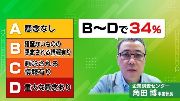 特定した裏アカは隅から隅まで調べ、【A】の「懸念なし」から【D】の「重大な懸念有り」まで4段階で評価します。これまでにのべ8万人を調査し、問題がある【B】から【D】に該当する人は実に34%に上ったといいます。